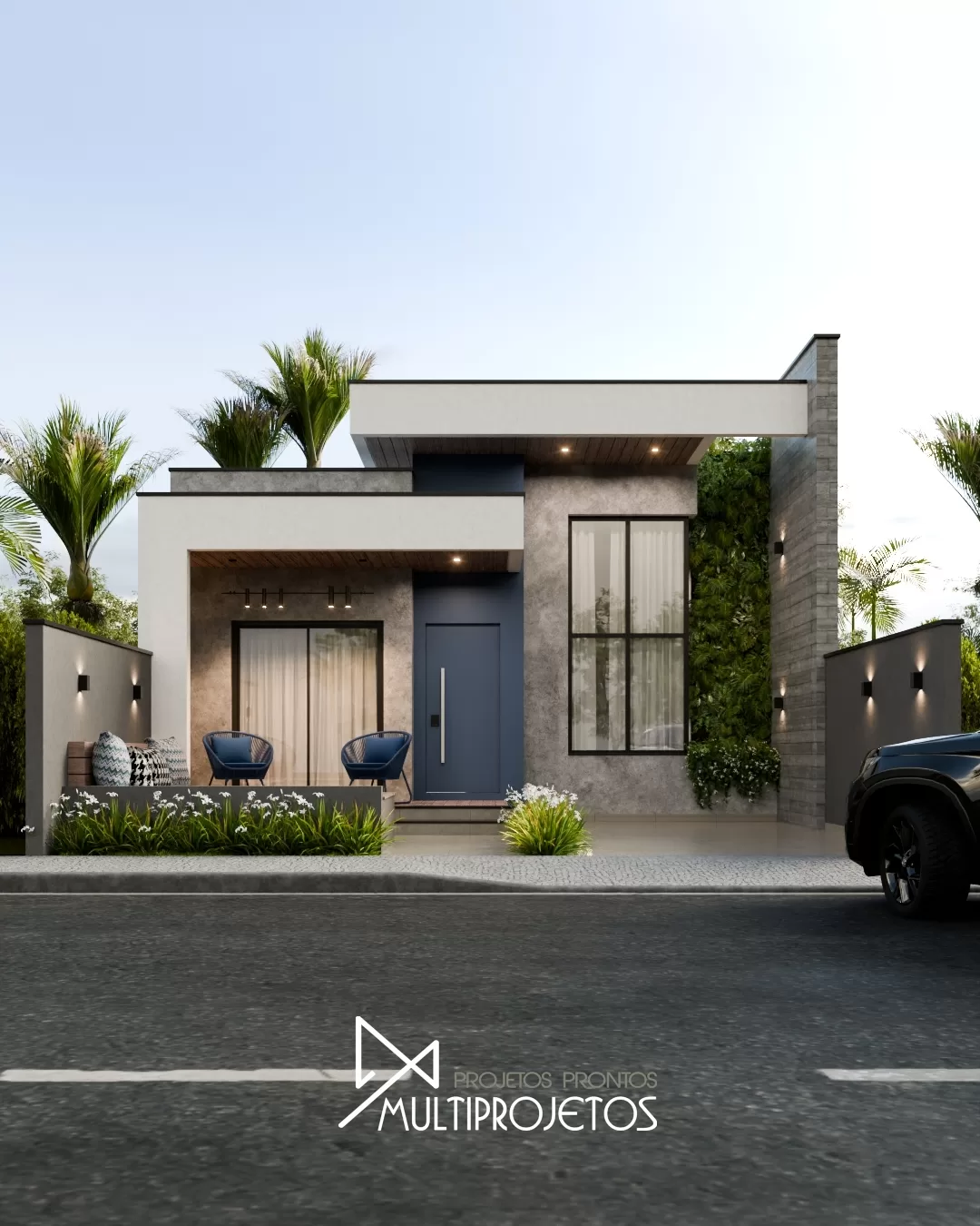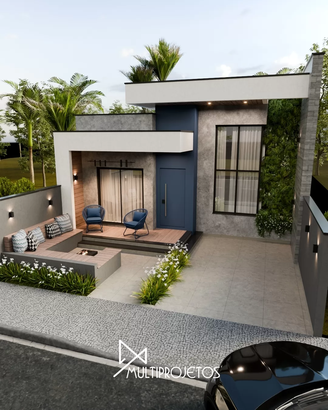 Projeto de casa moderna compacta com garagem descoberta