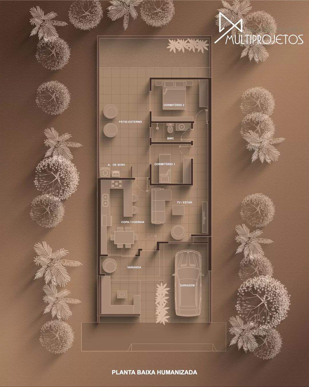 Implantada em um terreno de 8 x 20 metros, a casa ainda conta com uma vaga de garagem descoberta. Um projeto inteligente, ideal para quem busca viver com qualidade em um espaço compacto, funcional e cheio de charme.